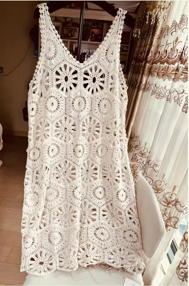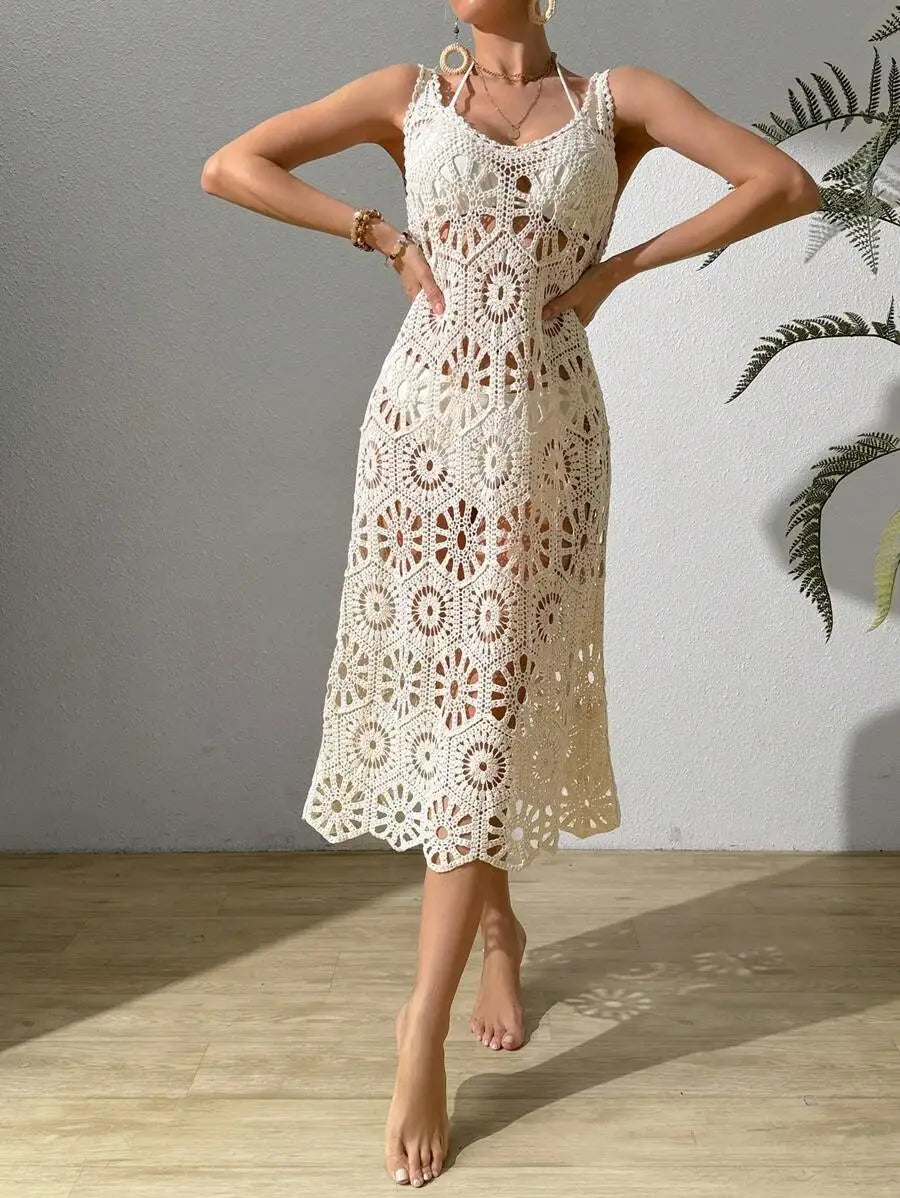 3D Flower Knitted Sling Long Dress Women Sexy Deep V-neck Backless Sleeveless Lace Up Femme Robes 2024 Summer Beach Dresses