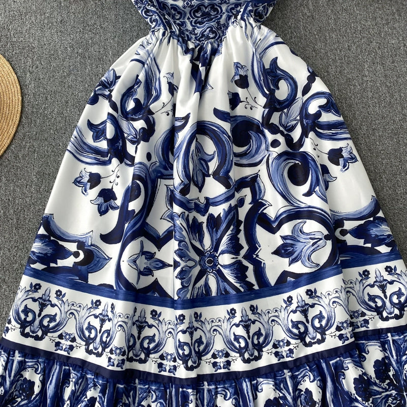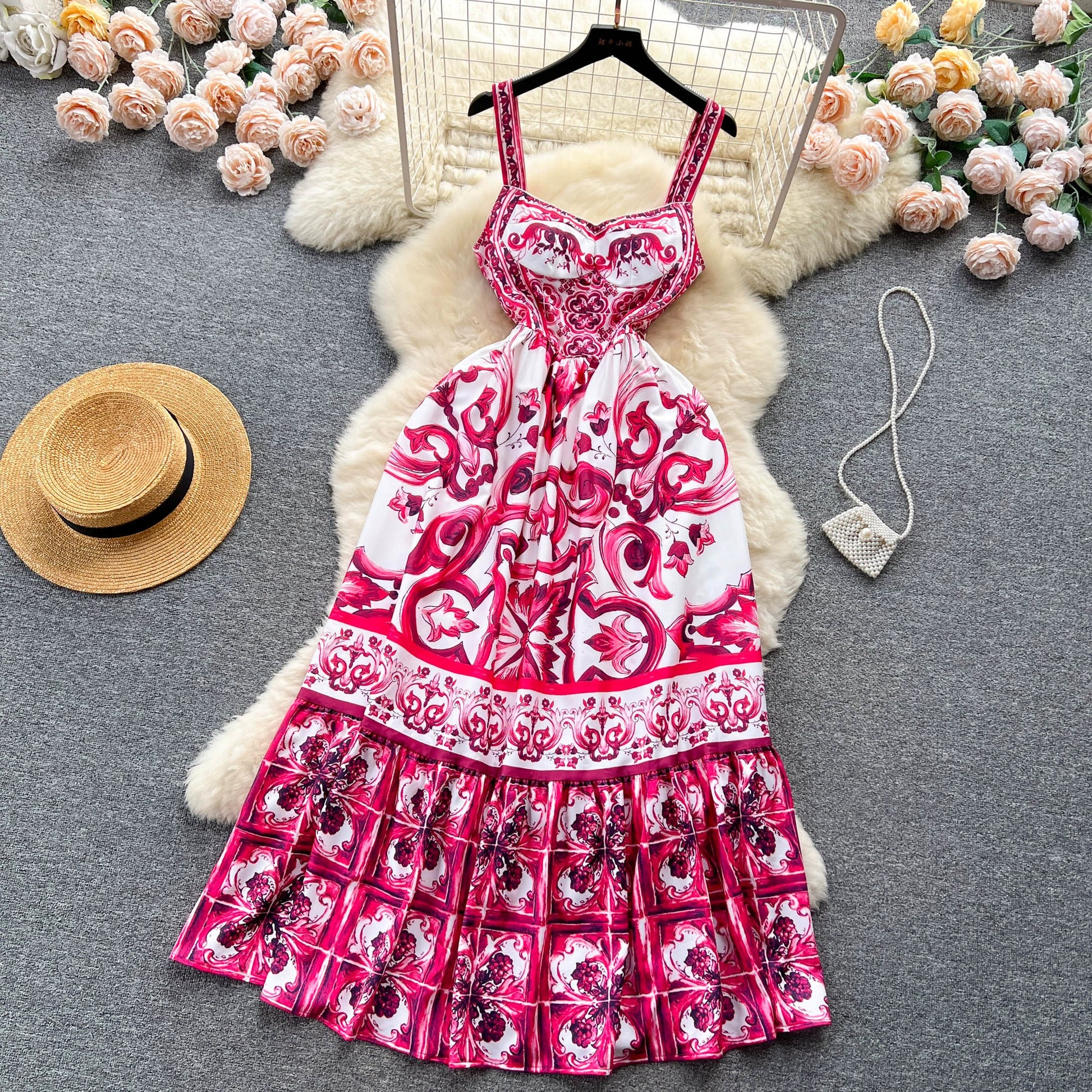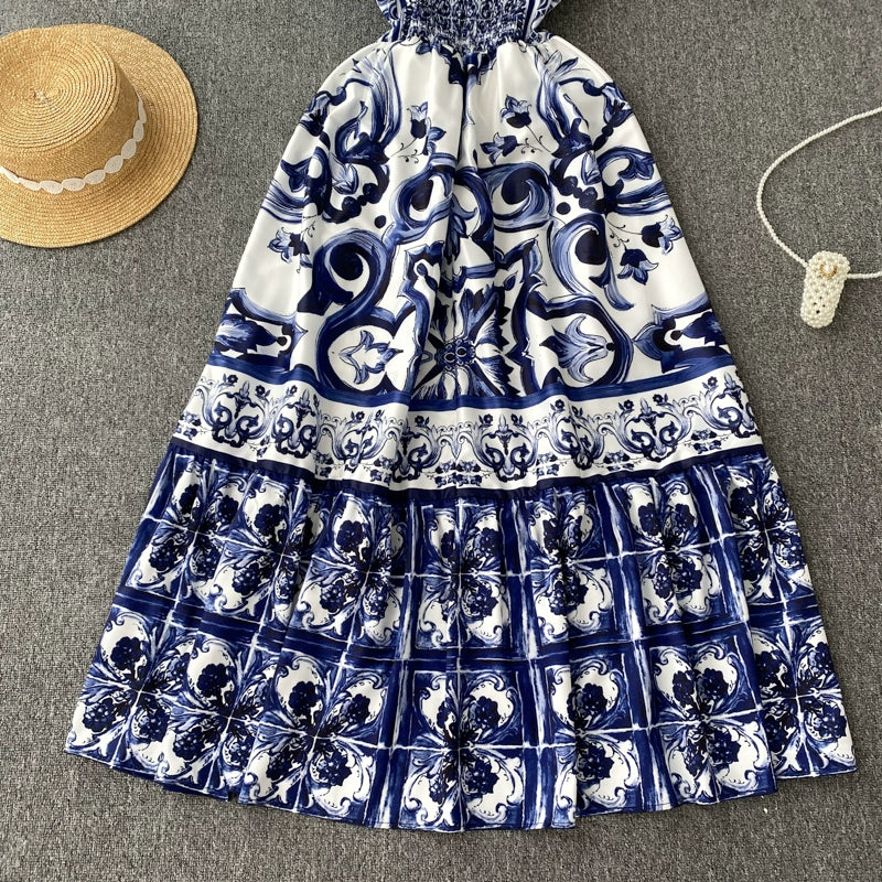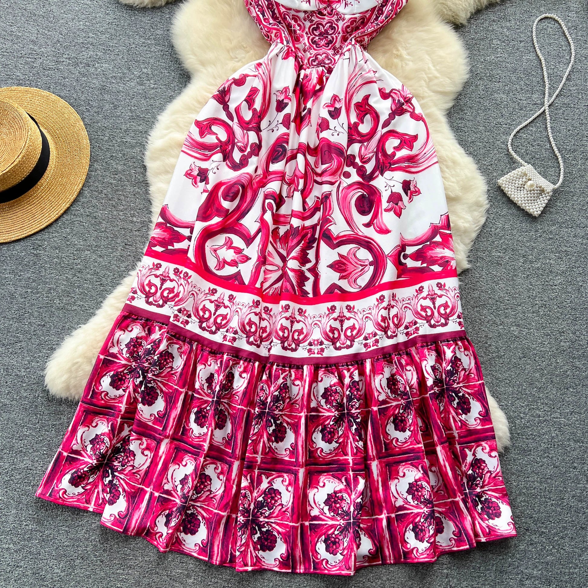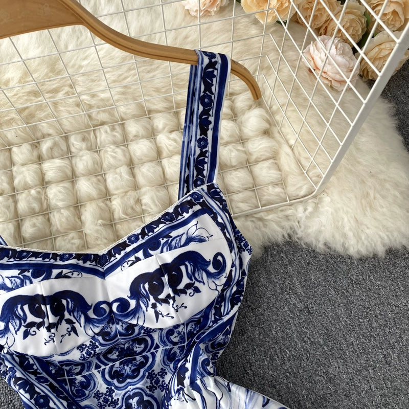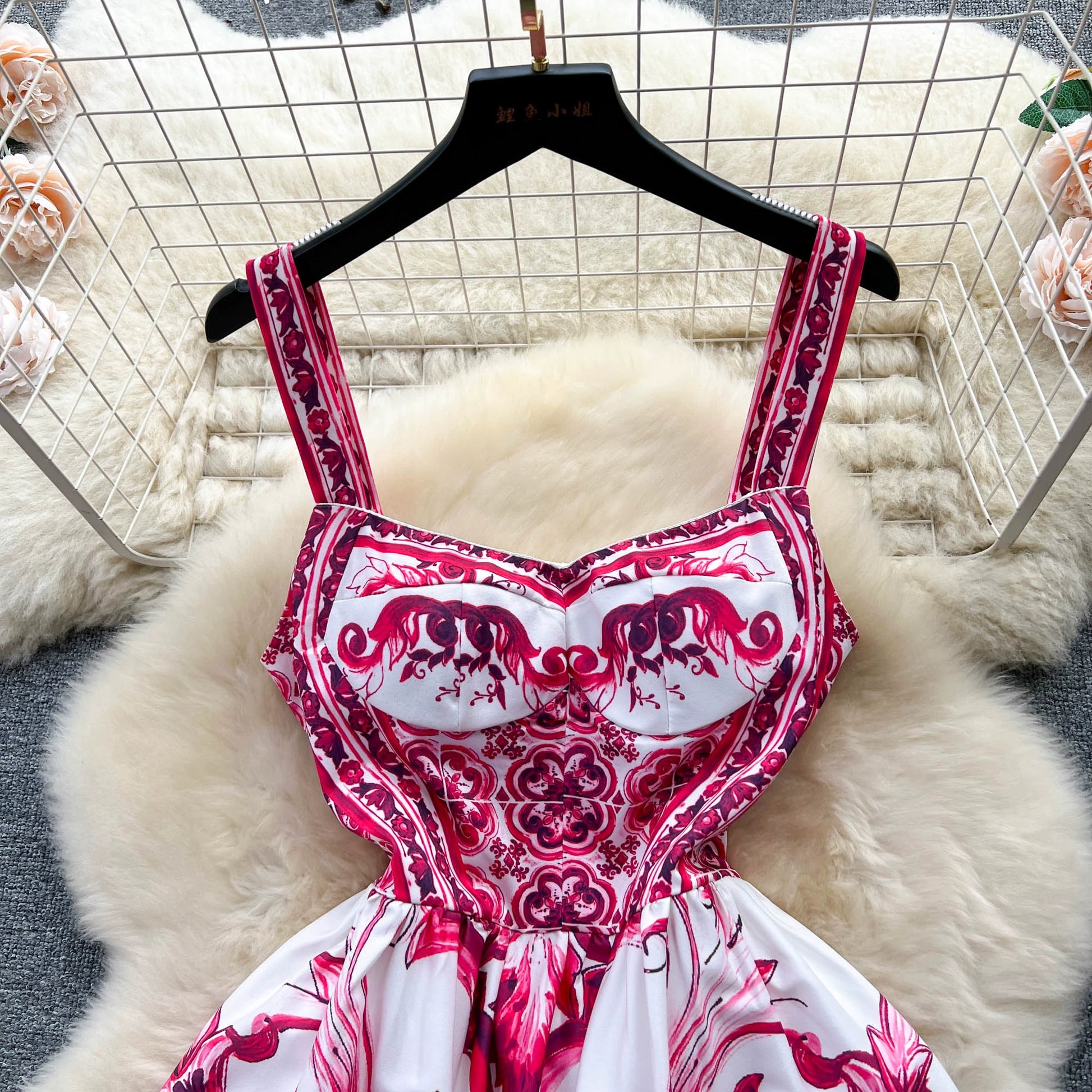 Women's V-Neck Red Blue and White Print Spaghetti Strap Holiday Maxi Dress Summer Runway Floral Print Vacation Long Robes
