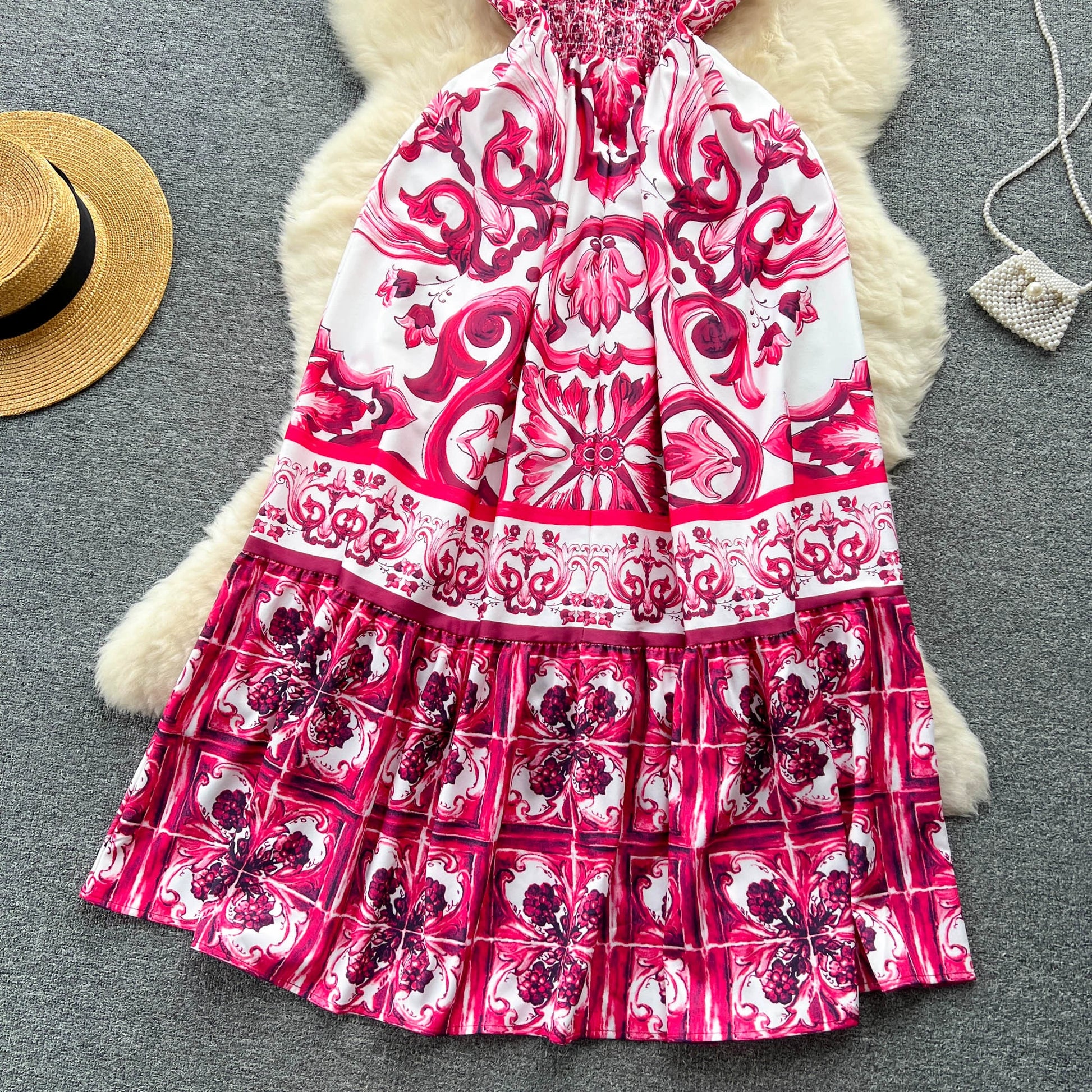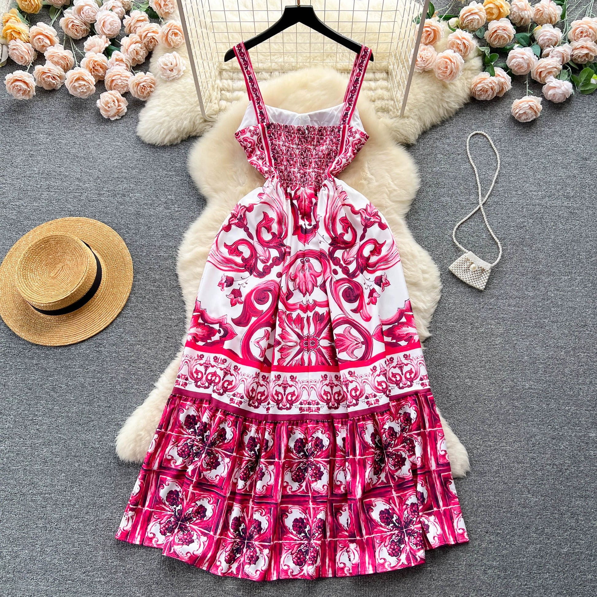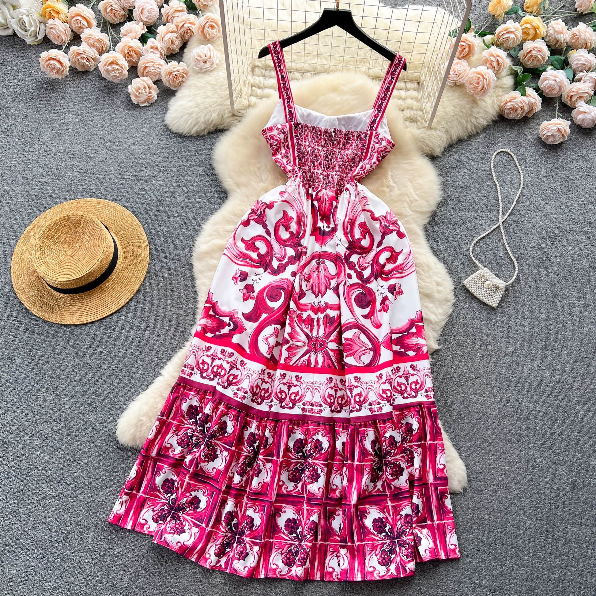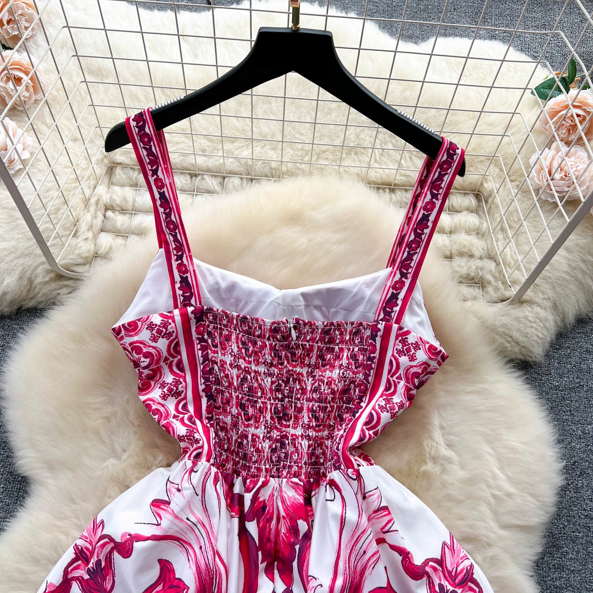 Women's V-Neck Red Blue and White Print Spaghetti Strap Holiday Maxi Dress Summer Runway Floral Print Vacation Long Robes