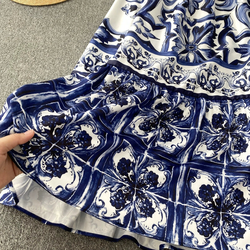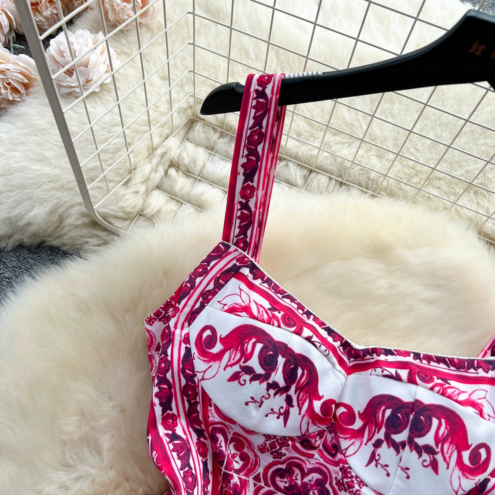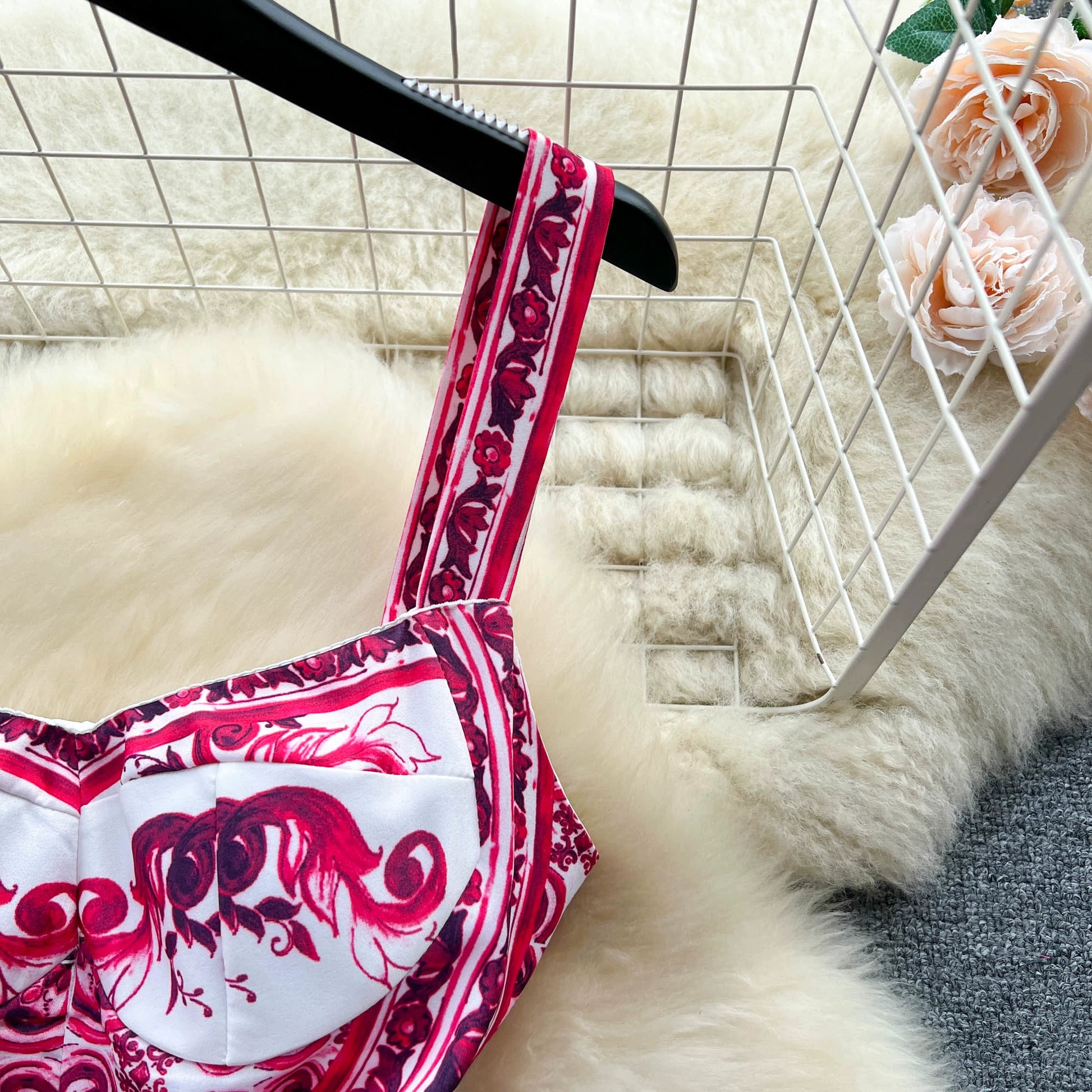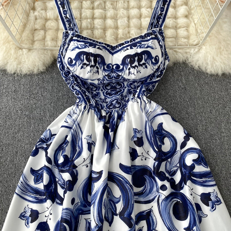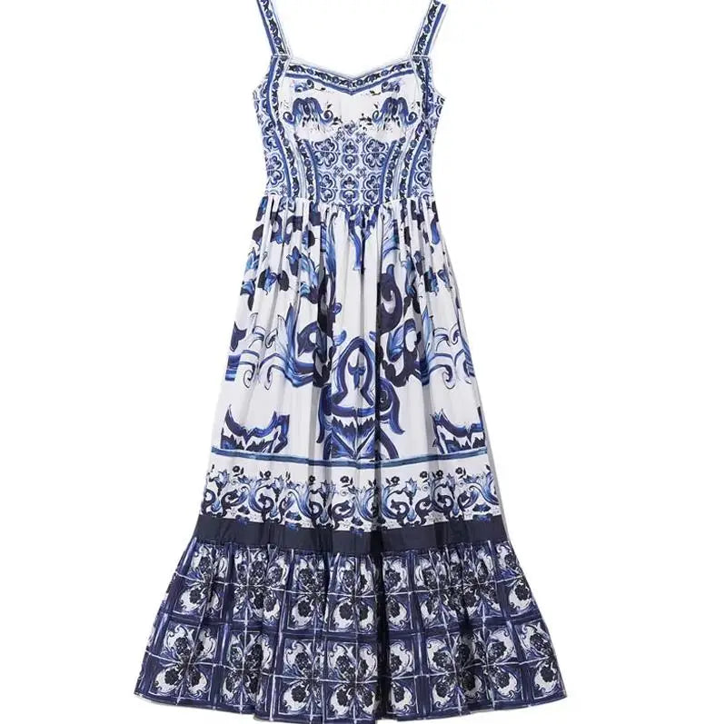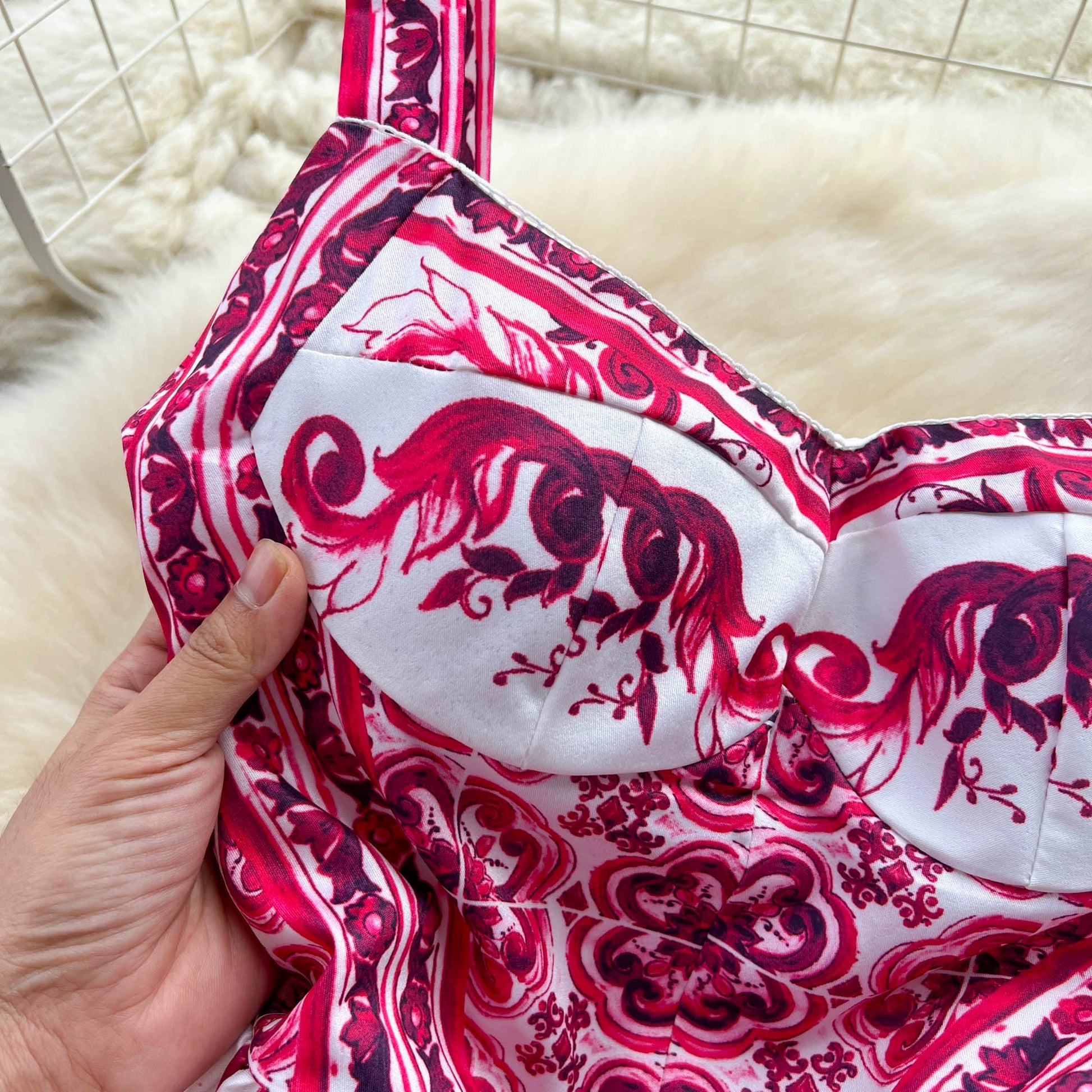 Women's V-Neck Red Blue and White Print Spaghetti Strap Holiday Maxi Dress Summer Runway Floral Print Vacation Long Robes